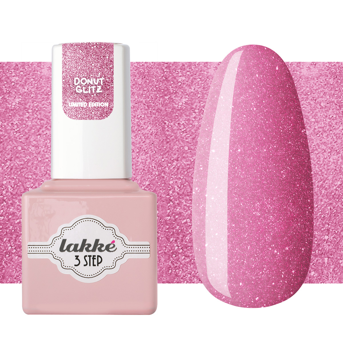 Lakké 3 Step “Donut Glitz” è un gel semipermanente glitterato color rosa con effetto disco flash. È ricchissimo di micro glitter olografici che creano un effetto luminosissimo alla luce diretta. Garantisce una perfetta copertura già dalla prima stesura di colore