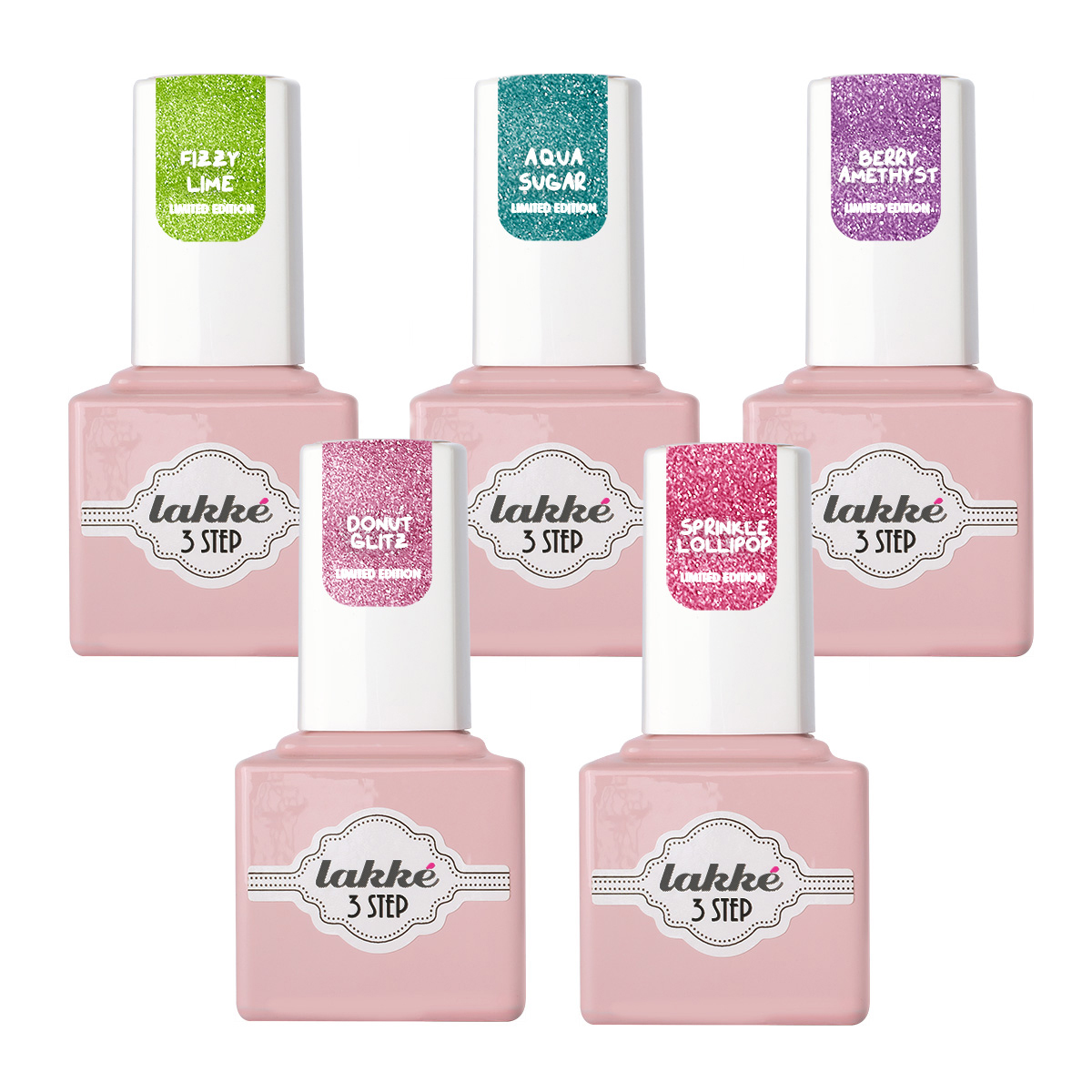 Mini collection kit con i cinque nuovi colori Lakké 3 Step della collezione “Sweet Bubble Glitz”.