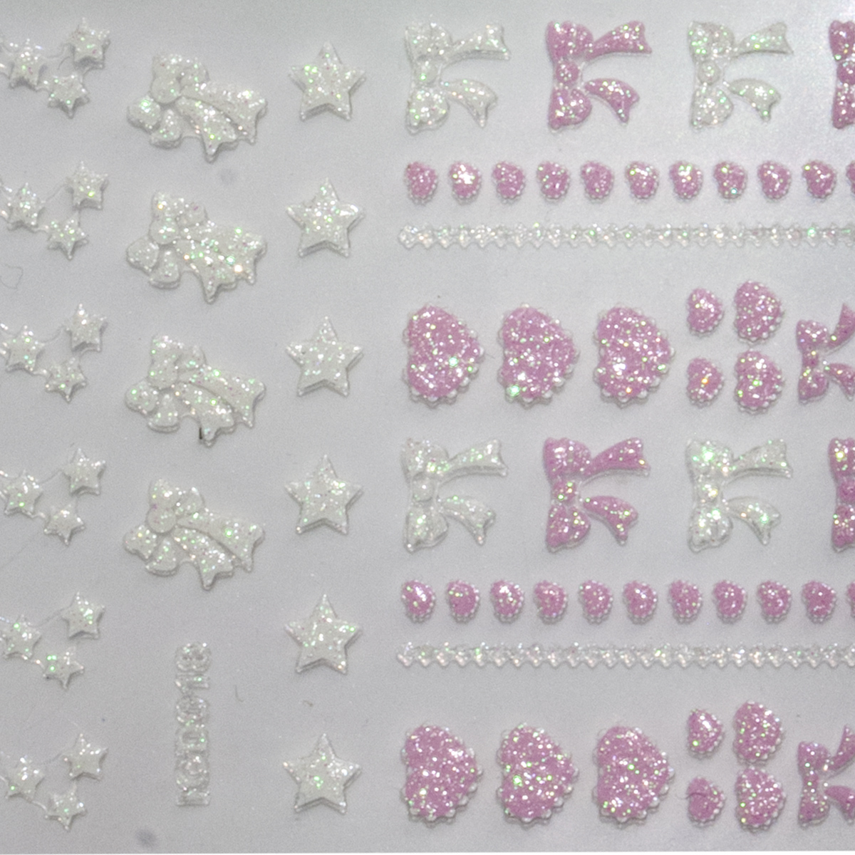 Adesivi per nail art pensati per rendere le tue nail art ancora più accattivanti! Sottili e semplicissimi da applicare. Inumidire con un nail pad, sollevare con una pinzetta e applicare sull’unghia o sul colore, infine sigillare con il Top in lampada. Fantasia: fiocchi, cuori e stelline bianche e rosa.