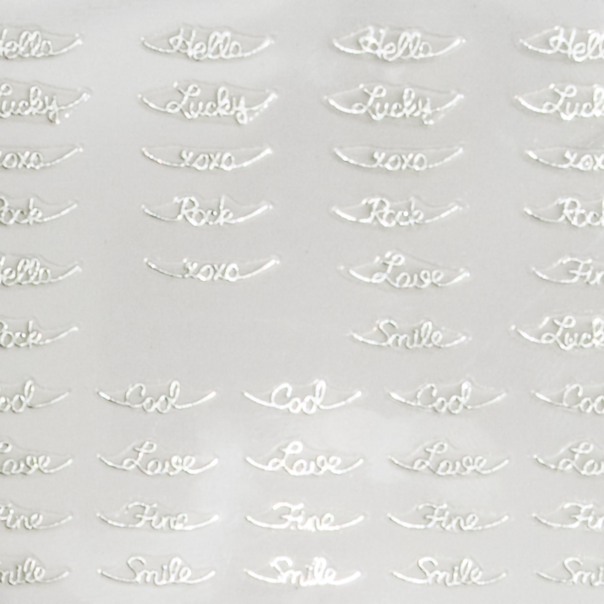 Adesivi per nail art pensati per rendere le tue nail art ancora più accattivanti! Sottili e semplicissimi da applicare. Inumidire con un nail pad, sollevare con una pinzetta e applicare sull’unghia o sul colore, infine sigillare con il Top in lampada. Fantasia: scritte varie colore bianco