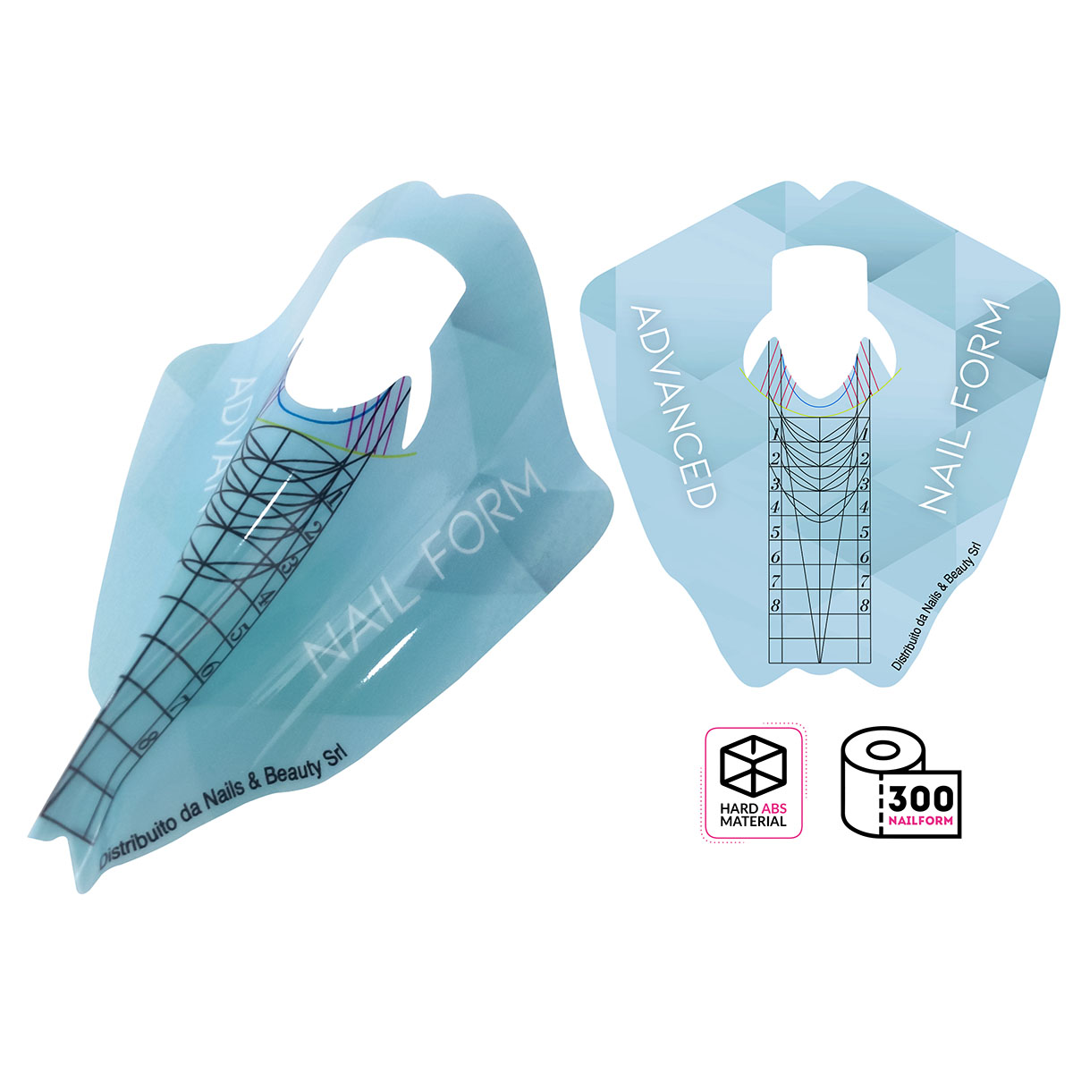 Nail form speciali che permettono altissime prestazioni. Realizzate con materiale altamente resistente (Hard ABS), permettono una precisa modellazione grazie ad unabase rigida. La parte adesiva permette una sicura adesione e la possibilità di riposizionamento della chiusura. Può essere utilizzata per piccoli allungamenti o per forme extra fino a 5 cm.